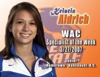 BOISE, Idaho Boise State University senior Kristin Aldrich was named Western Athletic Conference Gymnastics Specialist of the Week for the week of March 19-25, Tuesday.