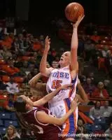 EUGENE, Ore. (12/4/2009) - Boise State saw its seven-game win streak snapped Friday night in Eugene, Ore., when the Oregon Ducks ran past the Broncos 88-61. It was one of those nights where nothing went right for the visitors as a combination of poor shooting, early foul trouble and turnovers were to much to overcome against a good Oregon squad. Tasha Harris and Jessica Van Hoogen led the Broncos with 15 points apiece as Boise State fell to 7-1 on the year.