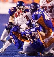 Key Bronco Plays: Ryan Dinwiddie finds Jay Swillie on a 54 yard touchdown pass with 7:12 to play, giving Boise State a 35-28 lead. Swillie bounced off one Fresno State defender and broke the tackle of another en route to the end zone. On the last play of the game, linebacker Greg Sasser sacks Bulldog quarterback David Carr before he could throw into the end zone.