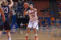 Lenhardt scored 14 of her 20 points in the final 20 minutes of play including a 7-2 run to open the second half to give the Broncos its first 20 point advantage at 50-30 with 18 minutes remaining. She shot eight-of-14 from the floor, two-of-three from the arc and two-for-two from the free-throw line. She also had eight rebounds, two blocks and one steal.