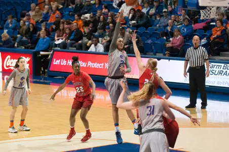 Shaw battled foul trouble most of the game but finished with a big 13 points, 10 in the first half, to go with four rebounds, two assists, one block and two steals in 28 minutes. The junior from Reno, Nev., went 6-of-10 from the floor to lead the Broncos with her 12th game in double-figure points.