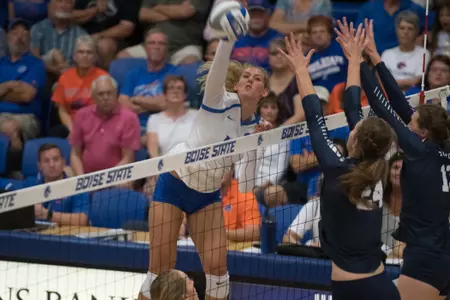 SAN DIEGO, Calif. - Boise State opened the match hot taking the first two sets while hitting 34 percent, but could not hold on as the Broncos went cold hitting 16 percent in the final three periods while San Diego State rallied for the victory 20-25, 24-26, 25-20, 25-19, 15-10. Sierra Nobley had a team-high 22 kills followed by Sabryn Roberts with a double-double on 15 kills and 12 digs.