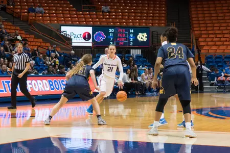 Boise State showed off a well-balanced offense in its win over Northwest Christian, as five Broncos scored in double figures. Led by senior Shalen Shaw's 16 points, the Broncos also got double-digit scoring contributions from sophomore guard Riley Lupfer (15 points), redshirt sophomore guard Ellie Woerner (12 points), and redshirt junior center Marijke Vanderschaaf (11 points).