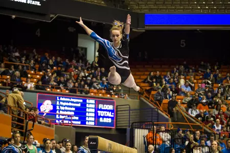 Boise State kept it consistent and posted its third-straight 49.125 event score on the third rotation -- floor. Urquhart started off with a 9.8 and Remme excelled for a 9.85. After Bennion's 9.775 and Stockwell's 9.825, Webb came through in the No. 5 spot with her 9.875 and secured the 49.125. After Webb hit, Boise State chose not to compete a sixth on floor.
