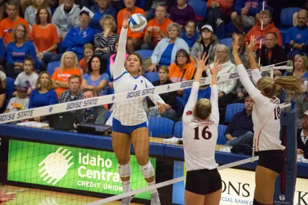 Hitting percentages played a key role in the victory for the Broncos who hit 27.2 percent, while holding the Aztecs to 9.7 percent, 12 percent below their season average. Boise State hit 34.3 percent in the first period and 29.7 percent in the third. SDSU did not hit above 20 percent in any of the sets.