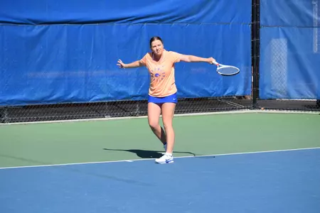 The entire singles lineup won their matches, with no third set needed at any point in the lineup. Palmer started things off at No. 2 singles as her opponent retired when she was up 6-1, 1-0. Then Dokic won at No. 1 singles, 6-1, 6-0. Then Hanna Kantenwein won at No. 3 singles, 6-4, 6-3. Nosek finished next at No. 4 singles, 6-1, 6-3, while Menjivar finished off her opponent at No. 5 singles, 6-0, 6-1. Timm finished off the match at No. 6 singles, 6-4, 6-2.
